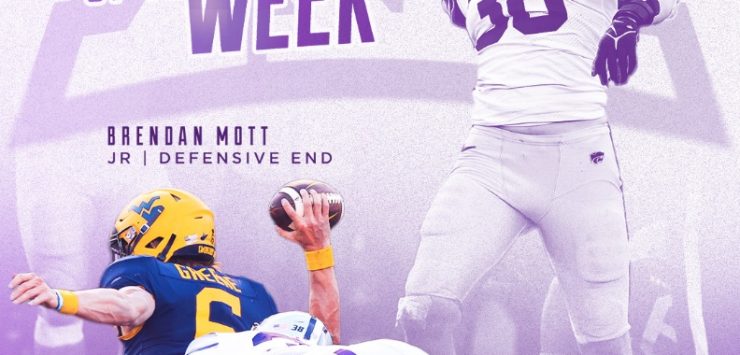 MANHATTAN, Kan. – Coming off a banner day in Kansas State’s 48-31 win at West Virginia, junior defensive end Brendan Mott has been named the Big 12 Defensive Player of the Week, the conference office announced Monday.