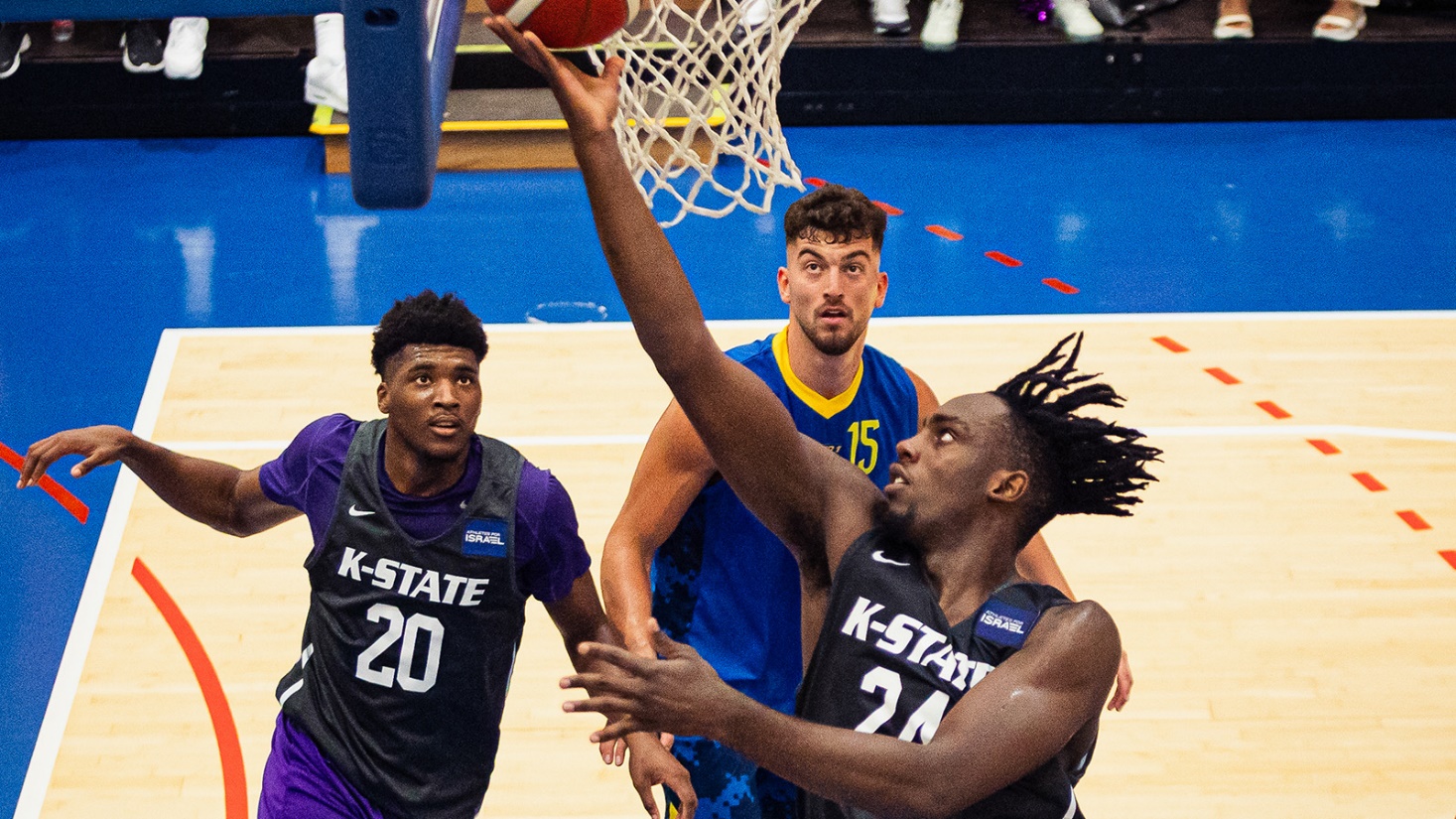 | Junior Arthur Kaluma paced five Wildcats in double figures with 23 points, as the Kansas State men’s basketball team opened its exhibition tour with a 94-87 win over the Israeli Select Team on Tuesday night (August 15) at the Hadar Yosef Arena in Tel Aviv, Israel. It was the Wildcats’ first exhibition game of their historic 10-day trip to Israel and Abu Dhabi, which began Wednesday, August 9 and runs until Sunday, August 20. |