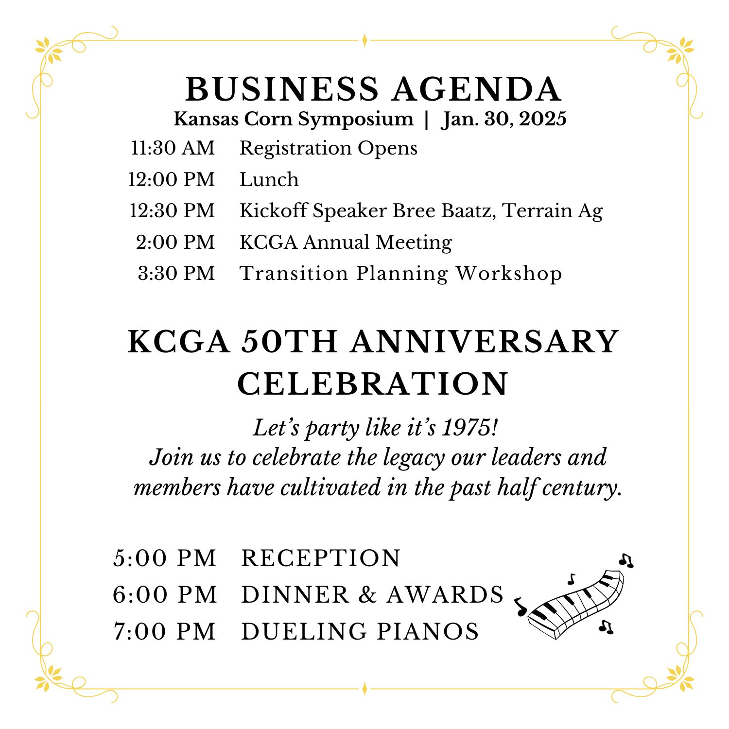 The Kansas Corn Growers Association will kick off its 50th Anniversary celebration at the Kansas Corn Symposium later this month in Salina. An event is scheduled for Thursday, Jan. 30 at the Salina Hilton Garden Inn.