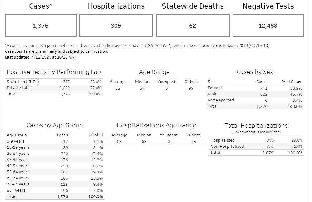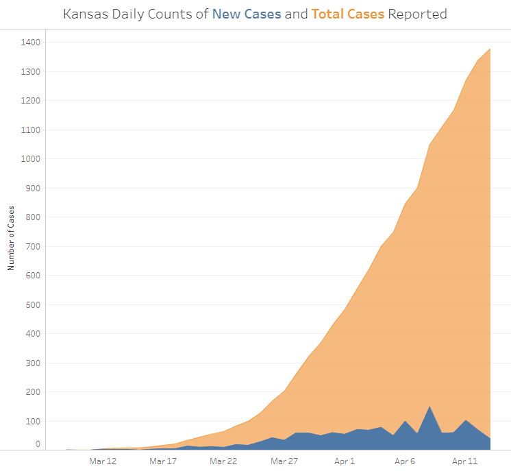 The Kansas Department of Health & Environment released its most up-to-date numbers as of 10:30 a.m. Monday and says that there are currently 1,376 cases of COVID-19 in the Sunflower State, with 62 related deaths. Meanwhile, out of the positive cases, there have been 309 Kansans hospitalized with the disease.