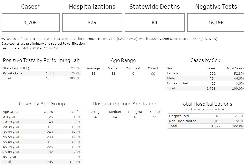 The Kansas Department of Health & Environment released its latest numbers at 11 a.m. Friday and says that 1,705 people have tested positive for COVID-19 in Kansas, with 84 related deaths.