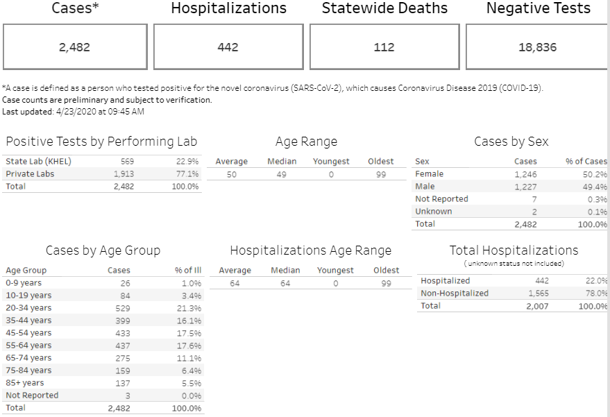 - Thursday, April 23: 2,482 cases of COVID-19, 112 deaths and 18,836 people have tested negative for the disease.
