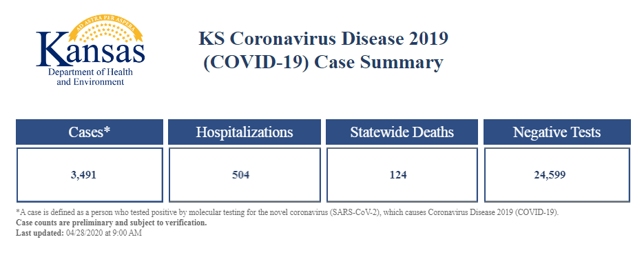 - Tuesday, April 28: 3,491 positive cases of COVID-19 in Kansas, 124 deaths and 24,599 negative tests.