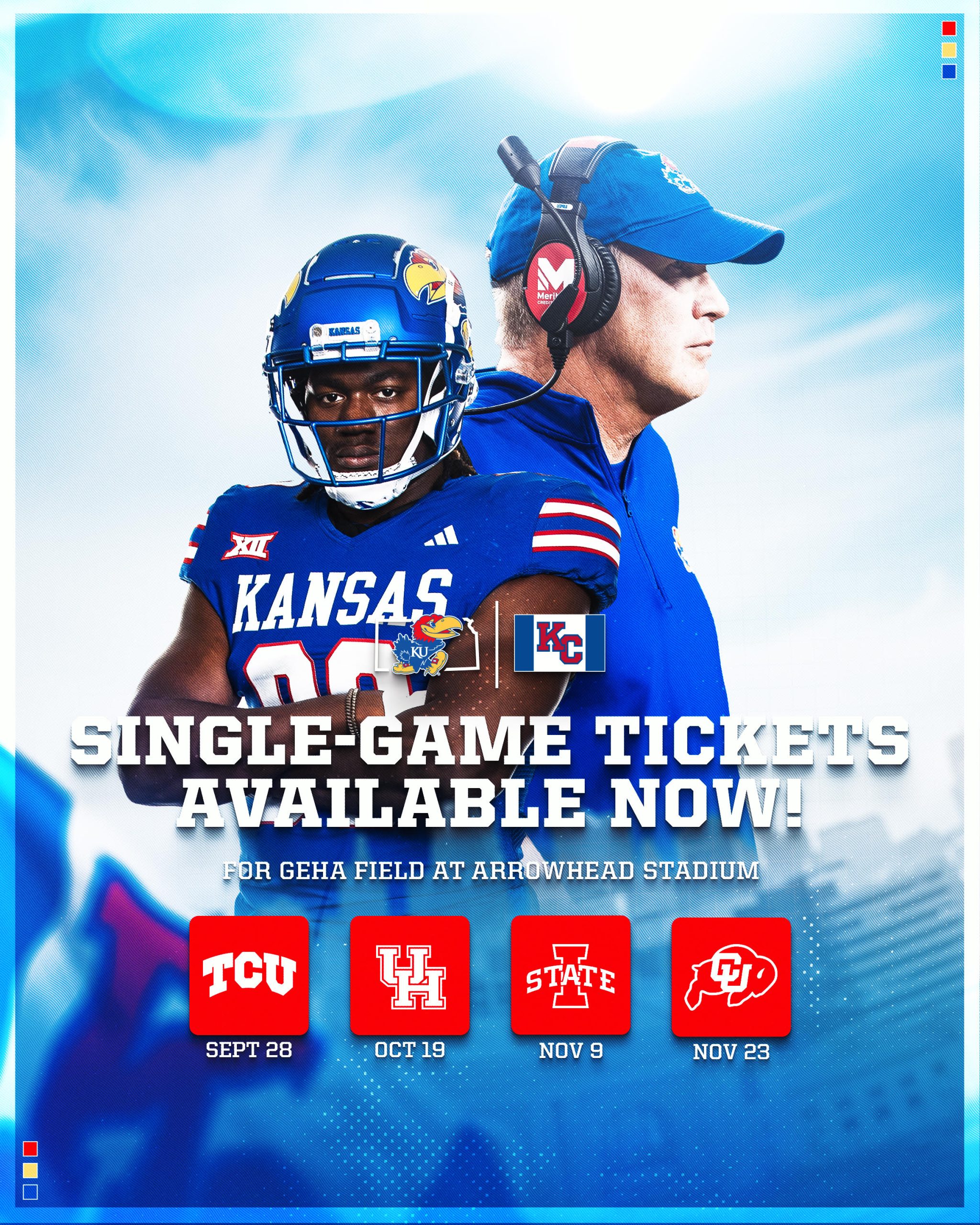 LAWRENCE, Kan. – Single game tickets for Kansas Football’s Big 12 Conference home games are now on sale. All four games will be played in Kansas City, Missouri, at GEHA Field at Arrowhead Stadium, home of the NFL’s Kansas City Chiefs.