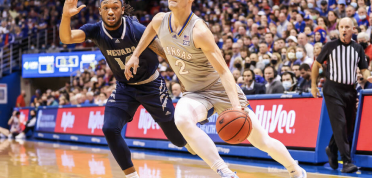 Nevada used a 5-0 run to get within six, 24-18, at the 8:19 mark, but a 7-0 run by the Jayhawks pushed the lead back to 13. KU would end the half in style, breaking a 7-0 Nevada run with consecutive 3-pointers from Christian Braun and Remy Martin, followed by a windmill dunk from Ochai Agbaji to push the lead to 12 at half. Braun led the way for the Jayhawks with 14 first-half points.