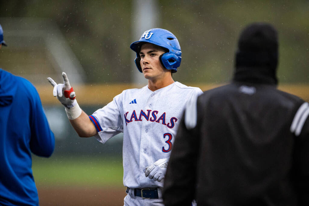 WICHITA, Kan. – On a wet night at Eck Stadium, the Kansas Jayhawks knocked off the 25th-ranked Wichita State Shockers 7-5 in 10 innings. Redshirt sophomore Michael Brooks delivered a 2-run single on a full count with the bases loaded and two outs in the 10th to break a 5-5 tie. Right-hander Kolby Dougan then came on and struck out three in a scoreless bottom half to close out the win.
