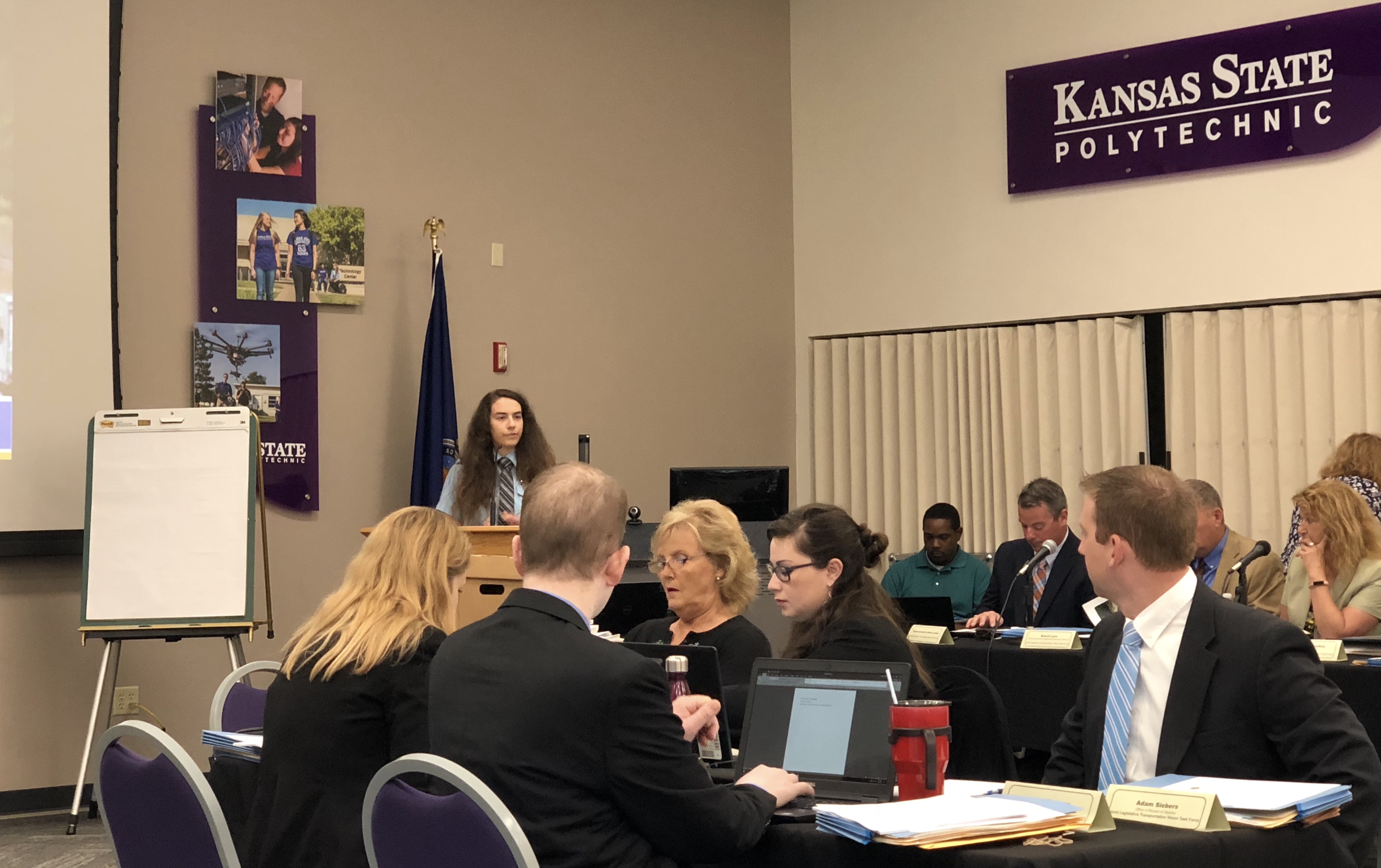 Photo: K-State Polytechnic Student Body Vice President, Shanna Walker, welcomes the members of the Transportation Vision Task Force to campus and to Salina.