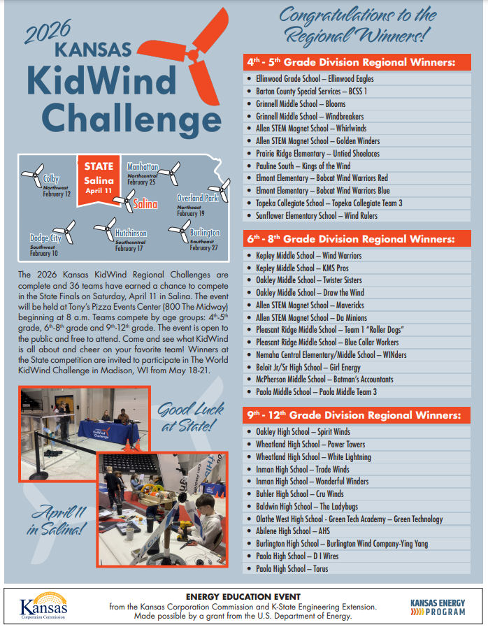 Thirty-six teams representing 25 Kansas schools will travel to Salina on Saturday with their sights set on winning a state title in the Kansas KidWind Challenge, and an opportunity to advance to the World KidWind Challenge in Madison, WI in May. Each team qualified for the state finals based on their performance in regional challenges, which drew a record number of 106 participating teams.