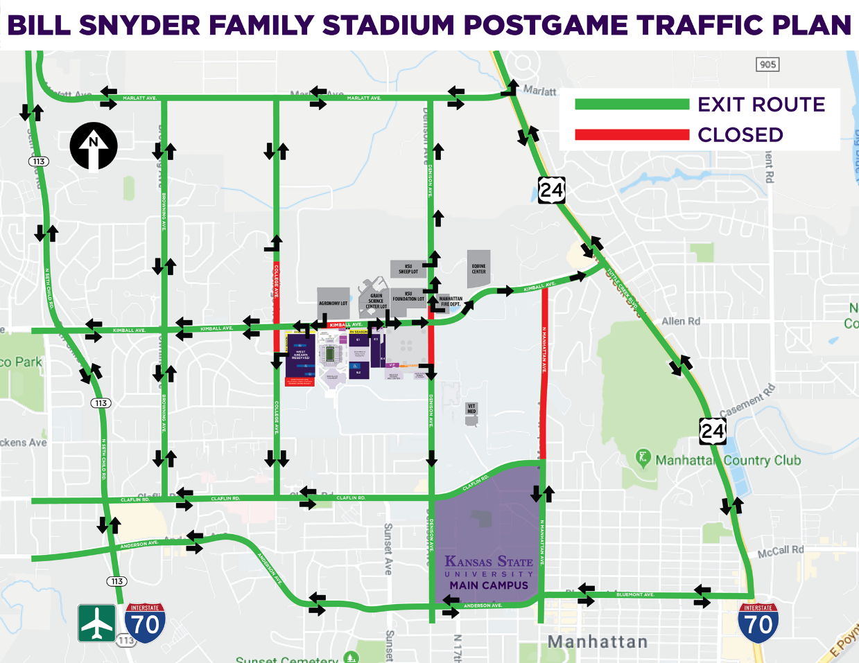 MANHATTAN, Kansas – As K-State football fans prepare to descend upon Manhattan for the home opener Saturday against South Dakota, all major roadways around Bill Snyder Family Stadium will be fully open for gameday traffic.