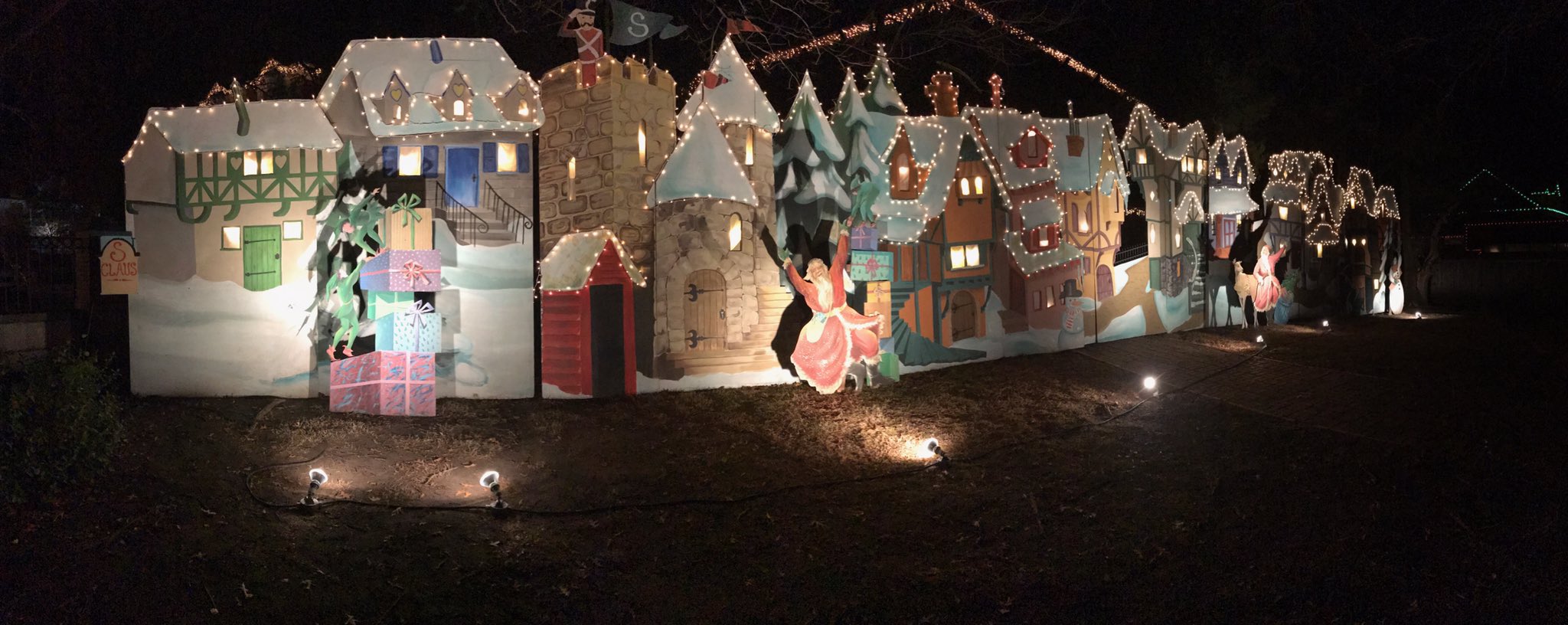 The large panels painted with festive Christmas town scenes span 120 feet and are 18 feet high at some points. They first appeared in Wichita nine years ago.