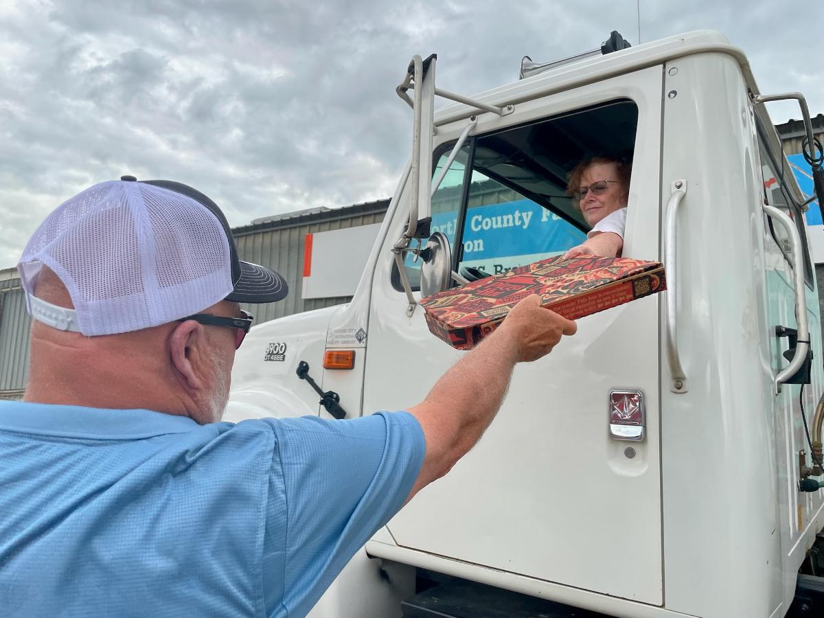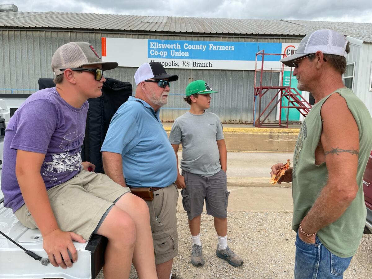 KSAL’s Roger Miles (center) with grandsons Parker and Berklee share pizza and stories about the harvest