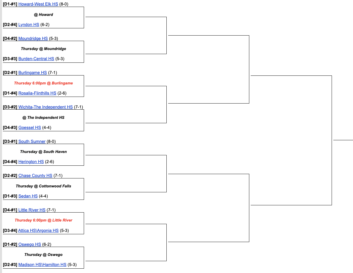 Little River is the top-seed out of District 4. They will host Argonia-Attica. The teams have not previously met this season.