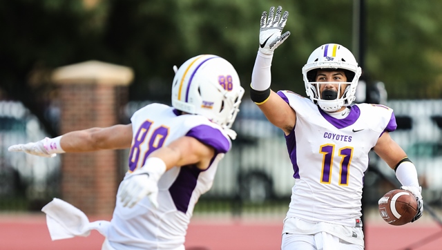 The ball continued to bounce the Coyotes’ way when the Falcons sent in a new punter after stalling on a drive. The low kick went to Poe-Evans at midfield. The returning All-American took it to the house for a 50-yard score. Feauto added TD passes of 25 and 33 yards to Poe-Evans and Simmons while junior tailback Demarco Prewitt scored on a nine-yard scamper to balloon the lead to 69-0 at the break.