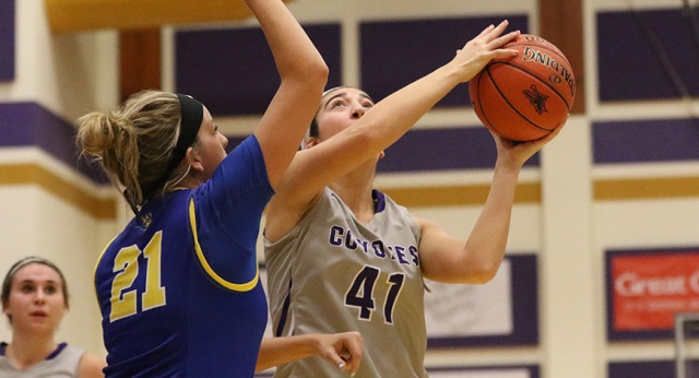 Back-to-back buckets by Amanda Hill (JR/Rossville, Kan.) and a three-pointer by Courtney Heinen (SR/Axtell, Kan.) sparked a 14-2 run for the Coyotes that made it 22-8 with 2:52 left on a score by Lauren Flowers (SO/Overland Park, Kan.). Kelcey Hinz (SO/Whitewater, Kan.)’ bucket just before the end of the first quarter gave the Coyotes a 24-10 lead after one.