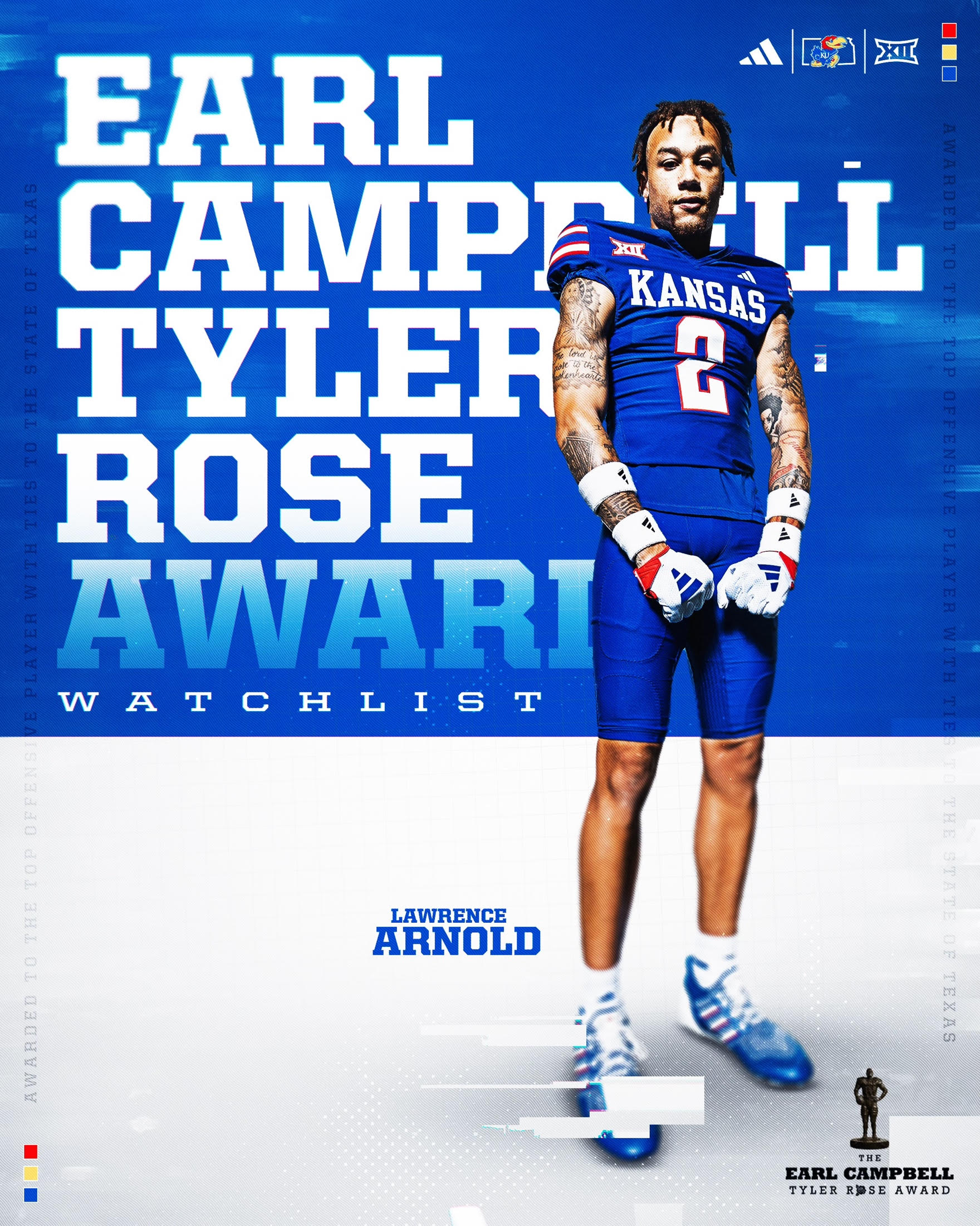 LAWRENCE, Kan. – For the second consecutive year, Kansas wide receiver Lawrence Arnold has been named to the watch list for the Earl Campbell Tyler Rose Award, which recognizes the nation’s outstanding Division I college offensive player who was either born in Texas, graduated from a Texas high school or played at a Texas-based junior college or four-year institution.