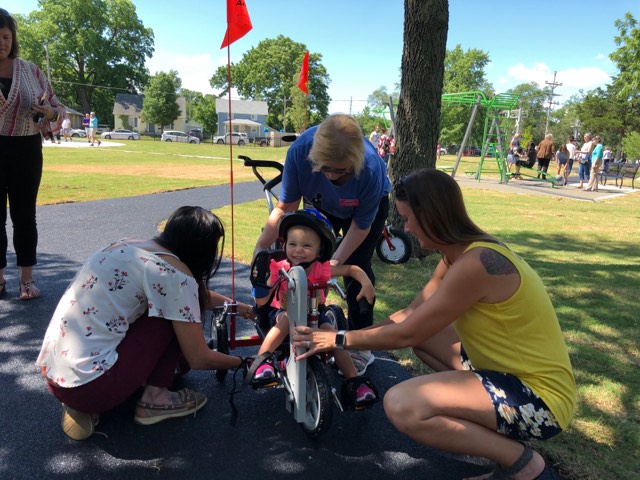 The Salina Noon Network Ambucs brought a couple of their amtryke adaptive tricycles to the event. Ava Scritchfield of Salina was presented one of them. Little Ava was all smiles as she rode her new tryke around the path at the park.