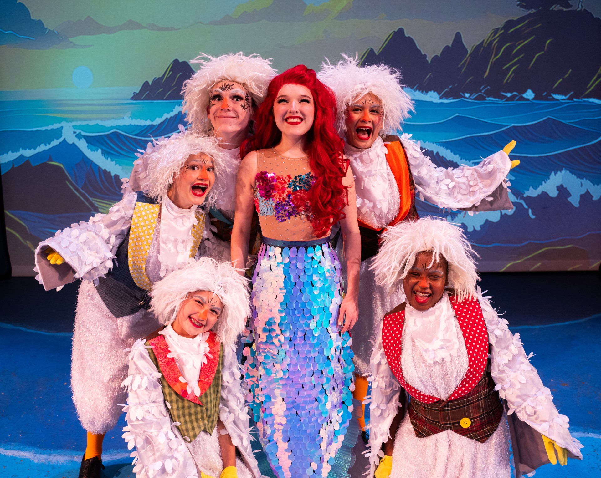Based on the Hans Christian Anderson tale, THE LITTLE MERMAID musical tells the story of Ariel, daughter of Triton, as she tries to find happiness and love beyond here undersea world. She is helped along the way by her friends Sebastian, the crab, Flounder, and Scuttle, the seagull. Of course, Ursula the Sea Witch creates problems for Ariel, but the young mermaid triumphs in the end finding love with Prince Eric.