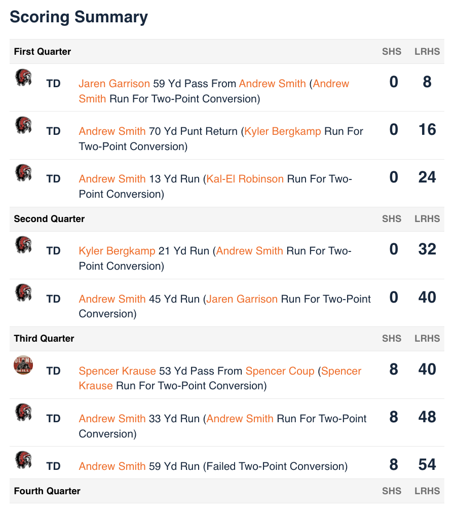 Little River would take control of this one early, as Andrew Smith would find Jaren Garrison for a long score. Smith would then return a Solomon punt 70 yards for a score, and rush in another from 13-yards out all before the end of the first quarter.