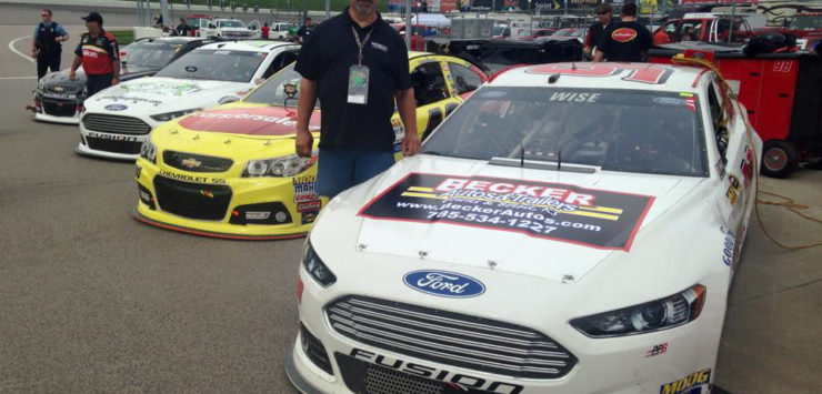 The Houshes went to attend the qualifying and truck races on Friday, May 8th. They purchased FinishLine passes to be able to take a tour of the pits. While watching the inspection process, they noticed the #98 car of Josh Wise had a blank hood. They decided to jump at the far chance of getting Becker Autos & Trailers name on it. Lydia Housh, co-owner of Becker Autos & Trailers, quickly grabbed a business card and handed it to a guy on the crew. She told them if they wanted a sponsor, Becker Autos & Trailers would be interested. It wasn’t more than 10 minutes later and #98 Josh Wise’s director of marketing came out to the fan walk and grabbed the Houshes and took them back to the hauler. She asked Blake and Lydia how quickly they could have a logo sent and where they wanted their name.