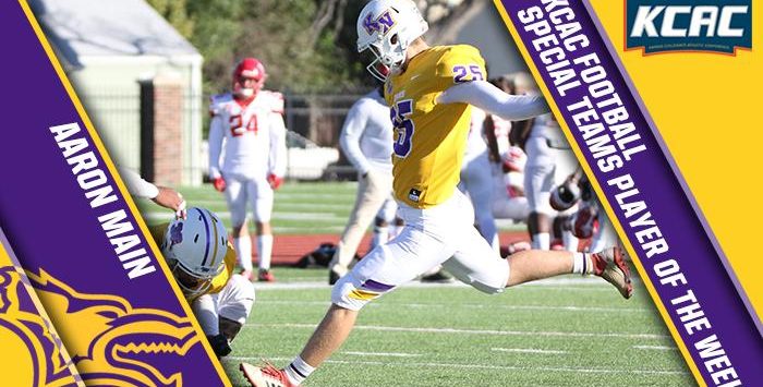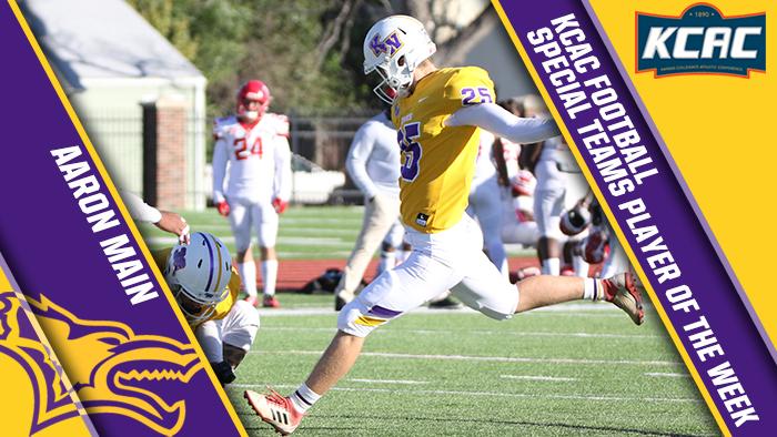 Kansas Wesleyan’s Aaron Main (JR/Tulsa, Okla.) has been named as the KCAC Football Special Teams Player of the Week for his efforts in helping the Coyotes defeat McPherson 45-17 on Saturday.