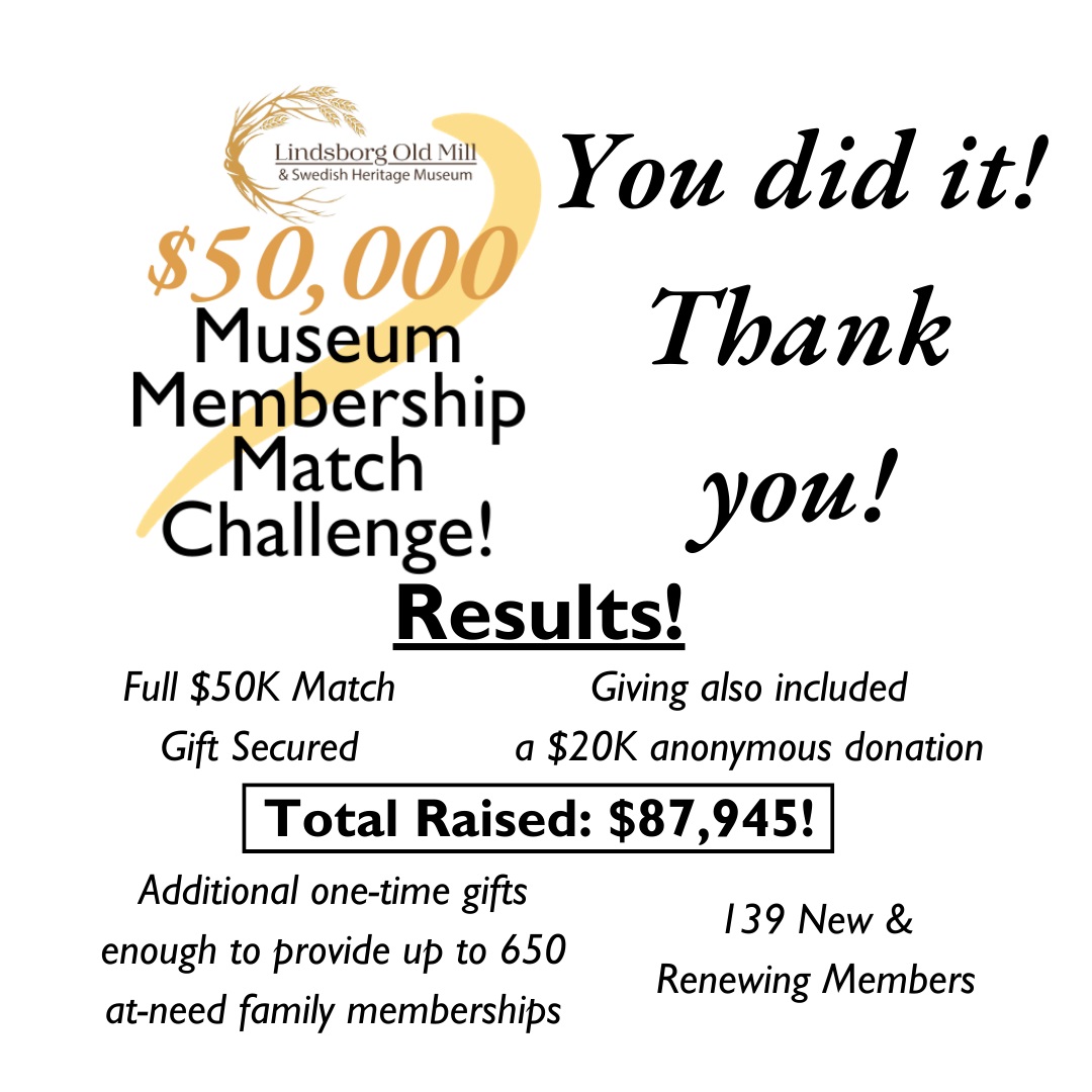 While the Match Challenge has ended, it’s still not too late to support the museum with one-time gifts at paypal.me/lindsborgoldmill or with an annual membership at www.oldmillmuseum.org/members.