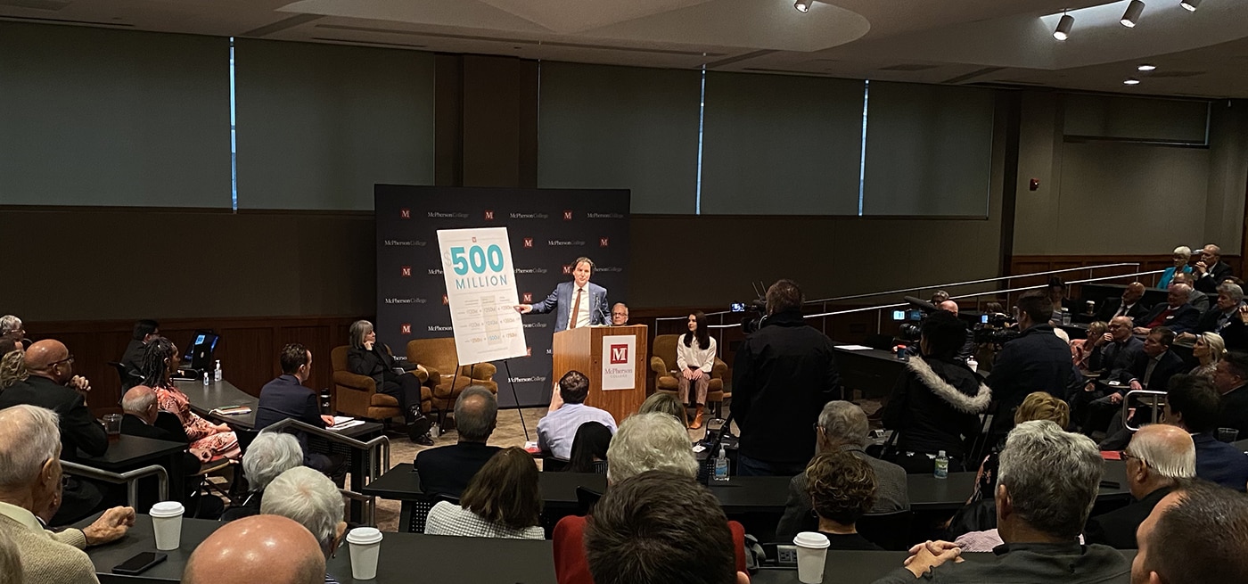 McPherson College President Michael Schneider announced the commitment at a press conference at the Kansas Leadership Center in Wichita. Also speaking were United States Senator Jerry Moran and Giving Pledge Signatory and California philanthropist Melanie Lundquist—representing the anonymous donor.