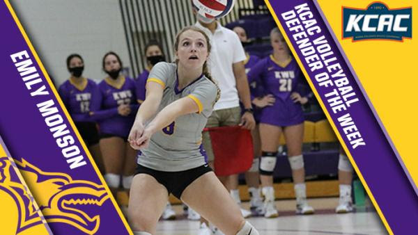 Following an outstanding performance on the week, Kansas Wesleyan’s Emily Monson (SR/Cheney, Kan.) has been selected as the KCAC Volleyball Defender of the Week for her efforts for the Coyotes last week.