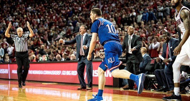 LINCOLN, Neb. – Trailing 72-70 with less than 30 seconds remaining, Kansas senior Sviatoslav Mykhailiuk connected on the go-ahead three-pointer to help the No. 13/12 Jayhawks to a 73-72 win over Nebraska inside Pinnacle Bank Arena Saturday night. Sophomore Udoka Azubuike led all scorers with a career-high 26 points, while senior Devonte’ Graham added 18 points.