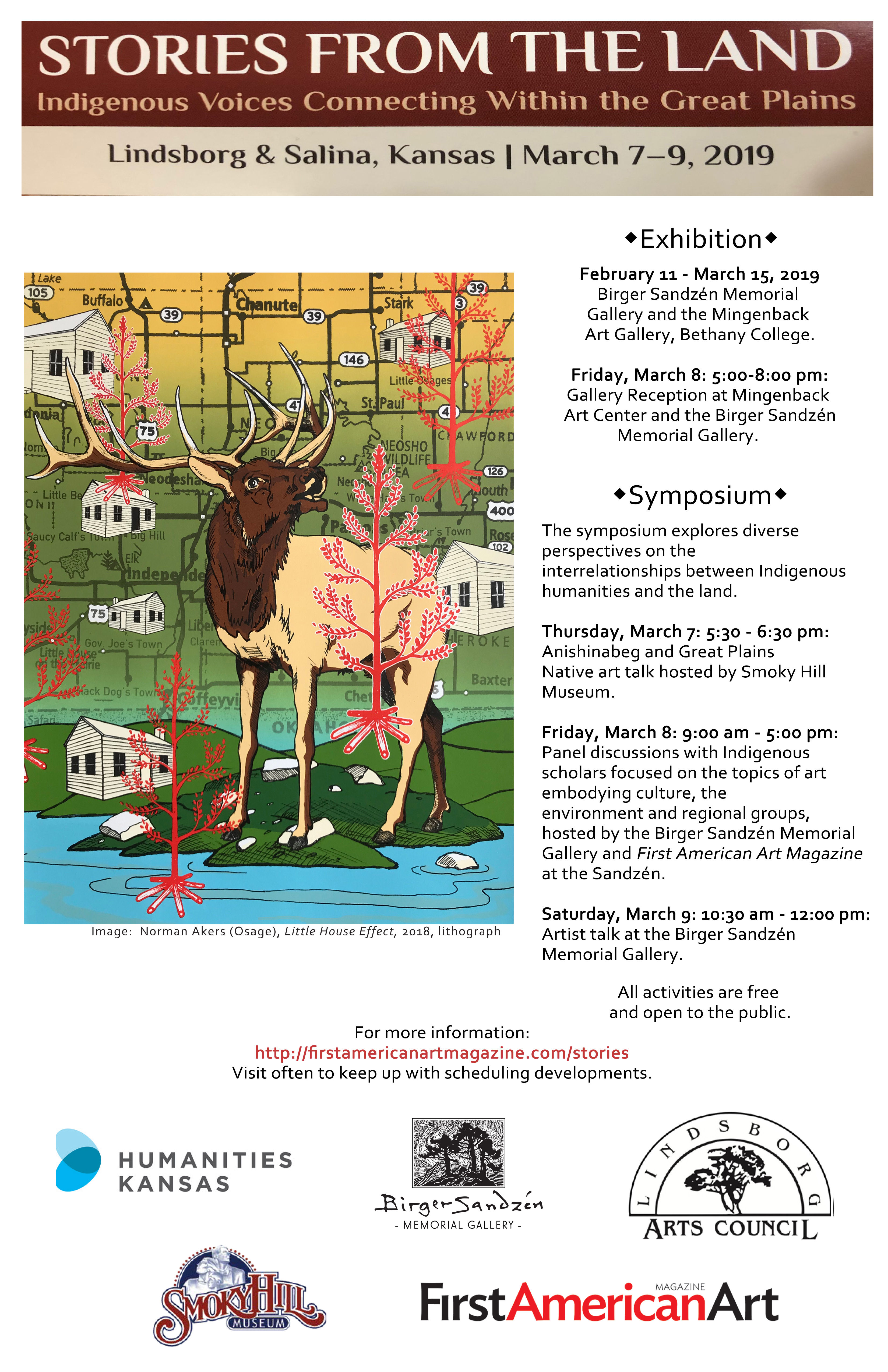 All events and activities associated with the symposium are free and open to the public. These events are made possible with generous support from Humanities Kansas, the Lindsborg Arts Council, and First American Art Magazine. Views expressed in the Stories from the Land Exhibition and during the Stories from the Land symposium are not necessarily those of Humanities Kansas or the Lindsborg Arts Council.