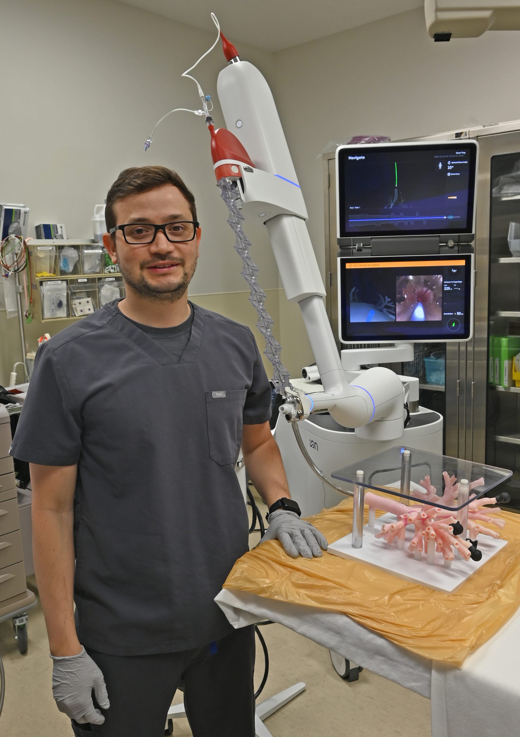 Photo via Salina Regional Health Center – Salina Regional Pulmonologist Jorge Cedano, M.D., with the Ion Robotic-Assisted Bronchoscopy system.