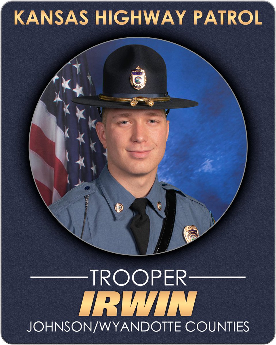 - Johnson/Wyandotte Counties – Trooper Samuel Irwin, K-396. Trooper Irwin’s wife, Cindy Irwin, placed his badge on him for the first time. His hometown is Scott City, Kansas. His duty stations are Johnson and Wyandotte Counties.