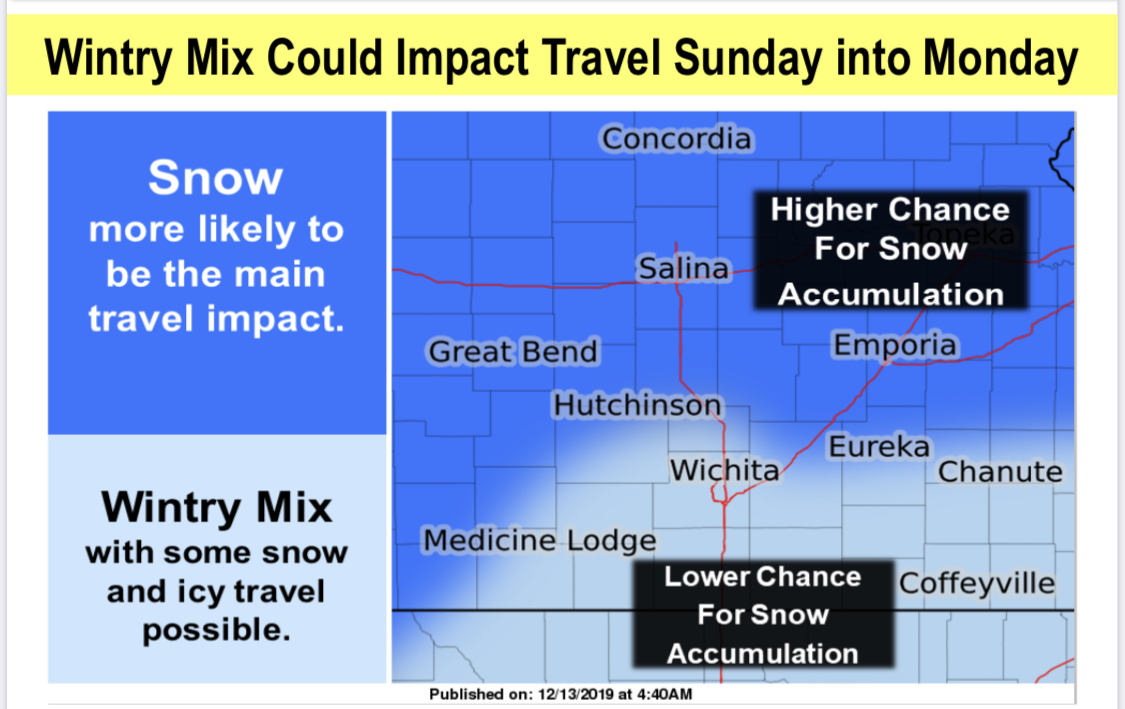 After a mild beginning to the weekend, a storm system will bring winter weather to the region on Sunday into Monday. According to the National Weather Service , the better chances for accumulating snowfall will impact central Kansas with lower chances across parts of south central and southeast Kansas. Hazardous travel conditions are likely due to ...