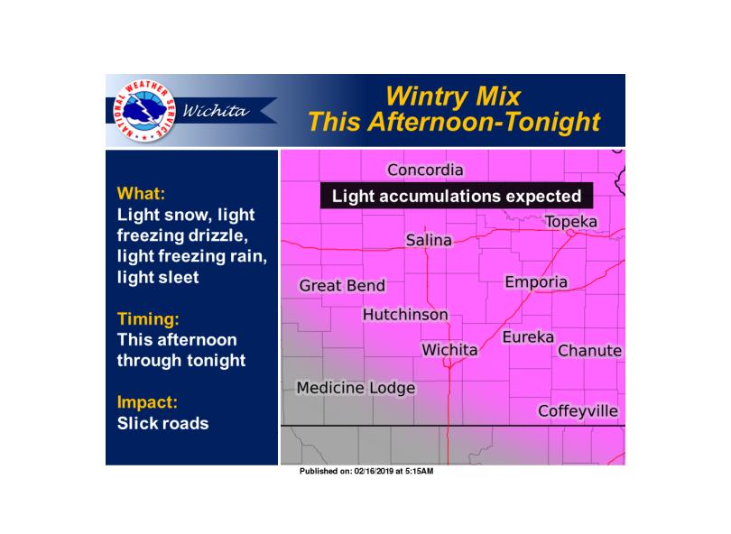 According to the National Weather Service, a light wintry mix of snow, freezing drizzle, sleet and freezing rain is expected across the region Saturday afternoon through Saturday night. Light accumulations are possible, making for patchy slick roads.