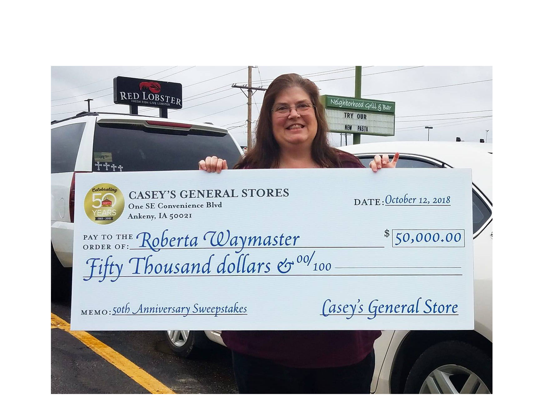A woman from Ellsworth has won a $50,000 grand prize. Roberta Waymaster was announced Friday as the grand prize winner of the Casey's General Store 50th anniversary sweepstakes. Waymaster was presented a $50,000 check. Waymaster described winning as "amazing and unbelievable". She added she is "forever blessed". What is Waymaster going to do with her newfound fortune? She wasn't ...
