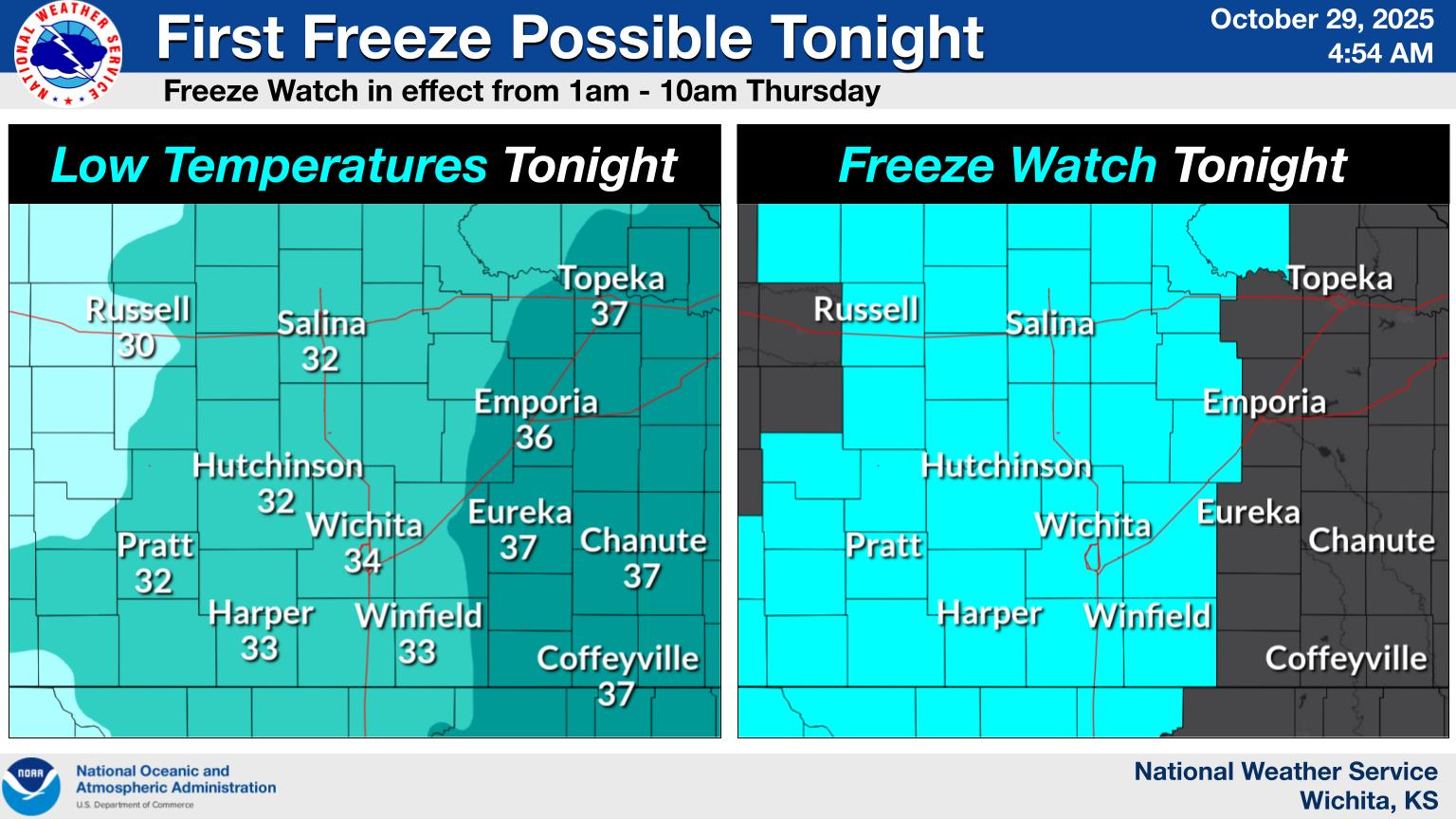 The first frost of the fall is possible this week, late Wednesday night into early Thursday morning. According to the National Weather Service, some locations in Central Kansas could experience the season’s first frost or freeze. Temperatures as cold as 30 degrees are forecast. A Freeze Watch has been issued for Thursday morning across portions of central ...