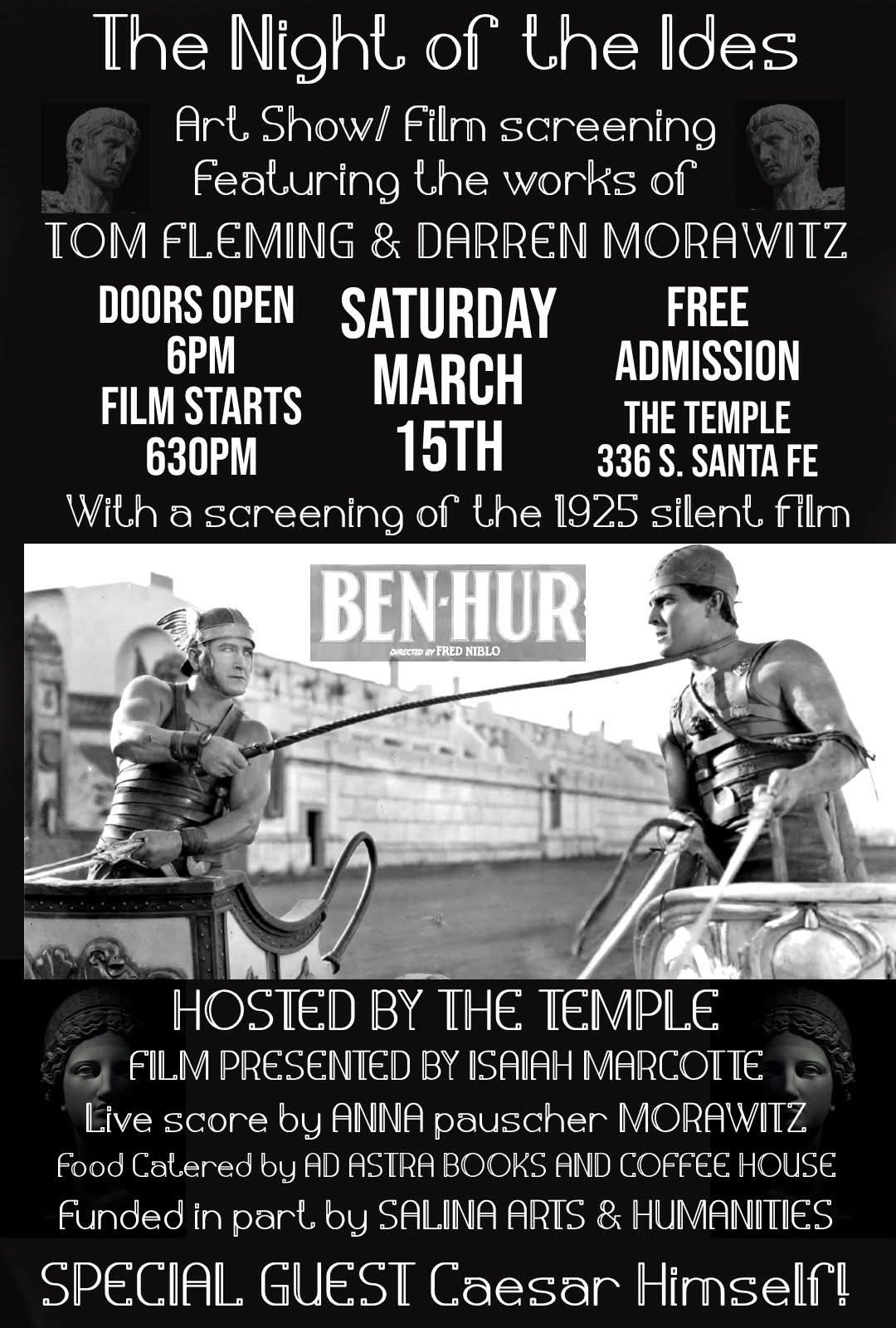 The “Night of the Ides” will feature an immersive art show by Tom Fleming and Darren Morawitz, accompanied by a casual screening of the 1925 silent film Ben-Hur presented by Isaiah Marcotte and scored live by Anna Pauscher Morawitz.