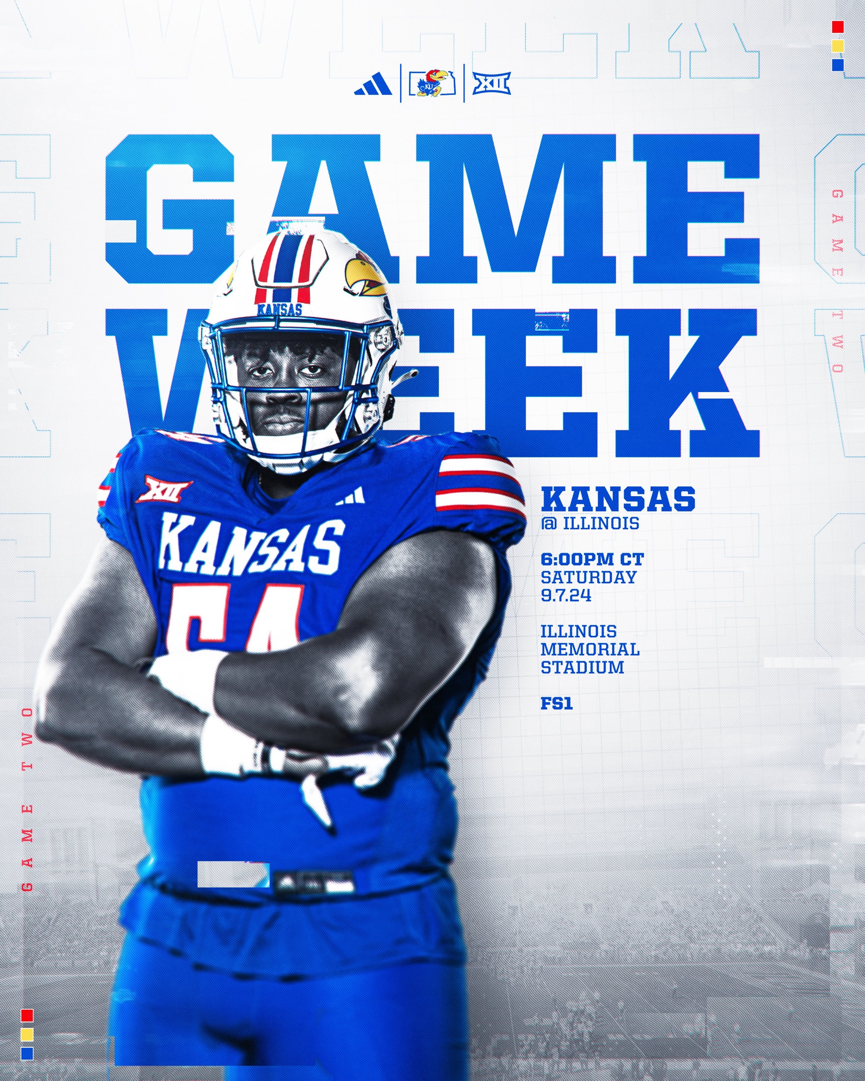 LAWRENCE, Kan. – The No. 22 Kansas Jayhawks will hit the road for the first time of the 2024 season, as the Jayhawks take on the Illinois Fighting Illini under the lights of Memorial Stadium on Saturday night. Kickoff is slated for 6 p.m. CT on FS1 with Alex Faust (Play-by-Play) and Robert Smith (Analyst) on the call.