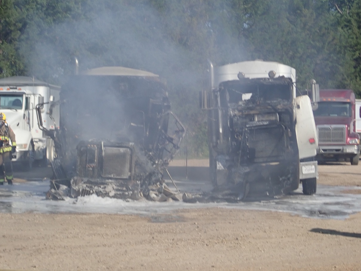 Two trucks hooked to trailers were parked next to one another when one caught fire, which then spread to the truck next to it. The two trucks are a 2008 International Tractor valued at $35,000 and a 2006 Kenworth valued at $40,000.