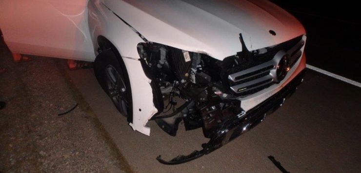 The accident occurred near mile marker #257 around 11:45pm Thursday evening. The Mercedes and the flatbed trailer were both towed from the scene.