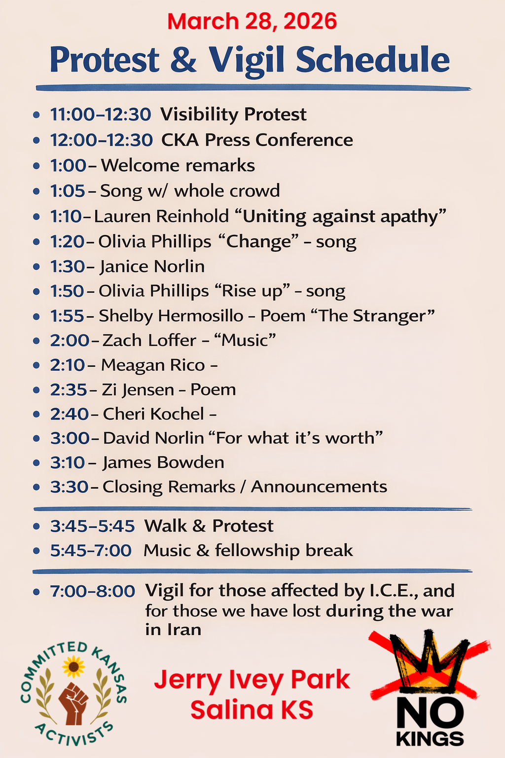 The Salina event will include a visibility protest beginning at 11:00 AM. At 1:00 1:00 PM, speakers will take the stage, sharing community perspectives and calls to action. A march will begin at around 3:30 PM, bringing participants together in a visible, unified presence through the community.