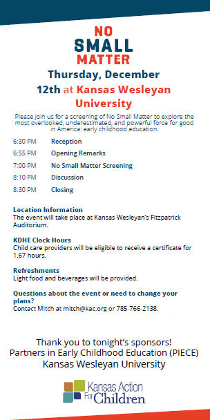 The 20 organization collaboration, Partners In Early Childhood Education, is partnering with KS Action for Children and Kansas Wesleyan to view the film, “No Small Matter,” which addresses this concern, on Thursday, December 12 from 6:30 – 8:30 pm at KWU’s Fitzpatrick Auditorium. This FREE event will conclude with opportunity to discuss how to be a part of the solution!