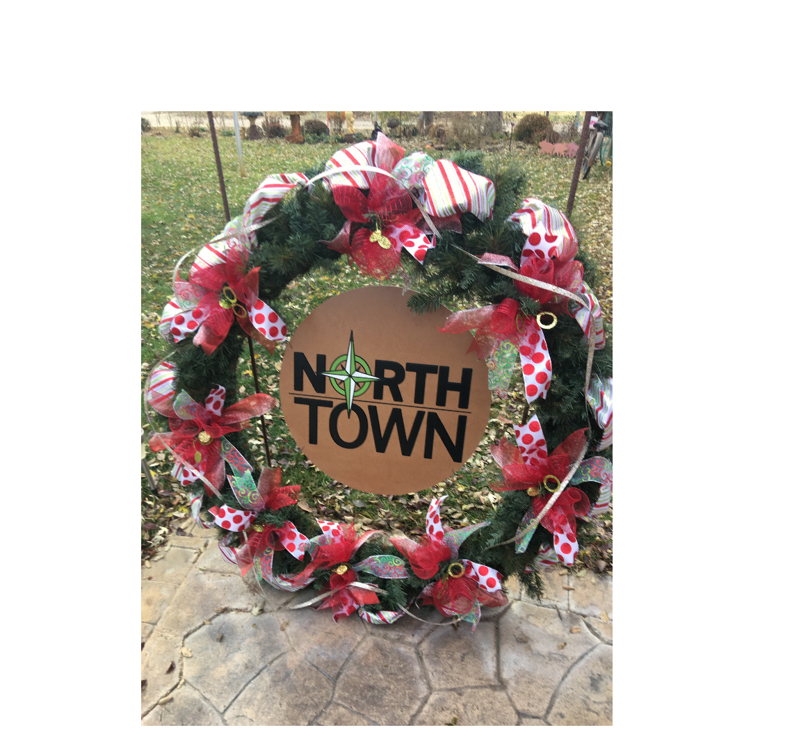 “First we came up with lighting the trees in 5 Corners Rain Garden. Then I thought about a big wreath with glitter that’d give people stopped at the intersections something pretty to look at. One thing led to another and Barb had her employees at Triad design the center insert. I painted the North Town logo on the insert after the wreath was decorated,” said Rose Base. Thanks to the time and talents of Rose Base, a seasonal wreath now adorns the North Salina entrance.