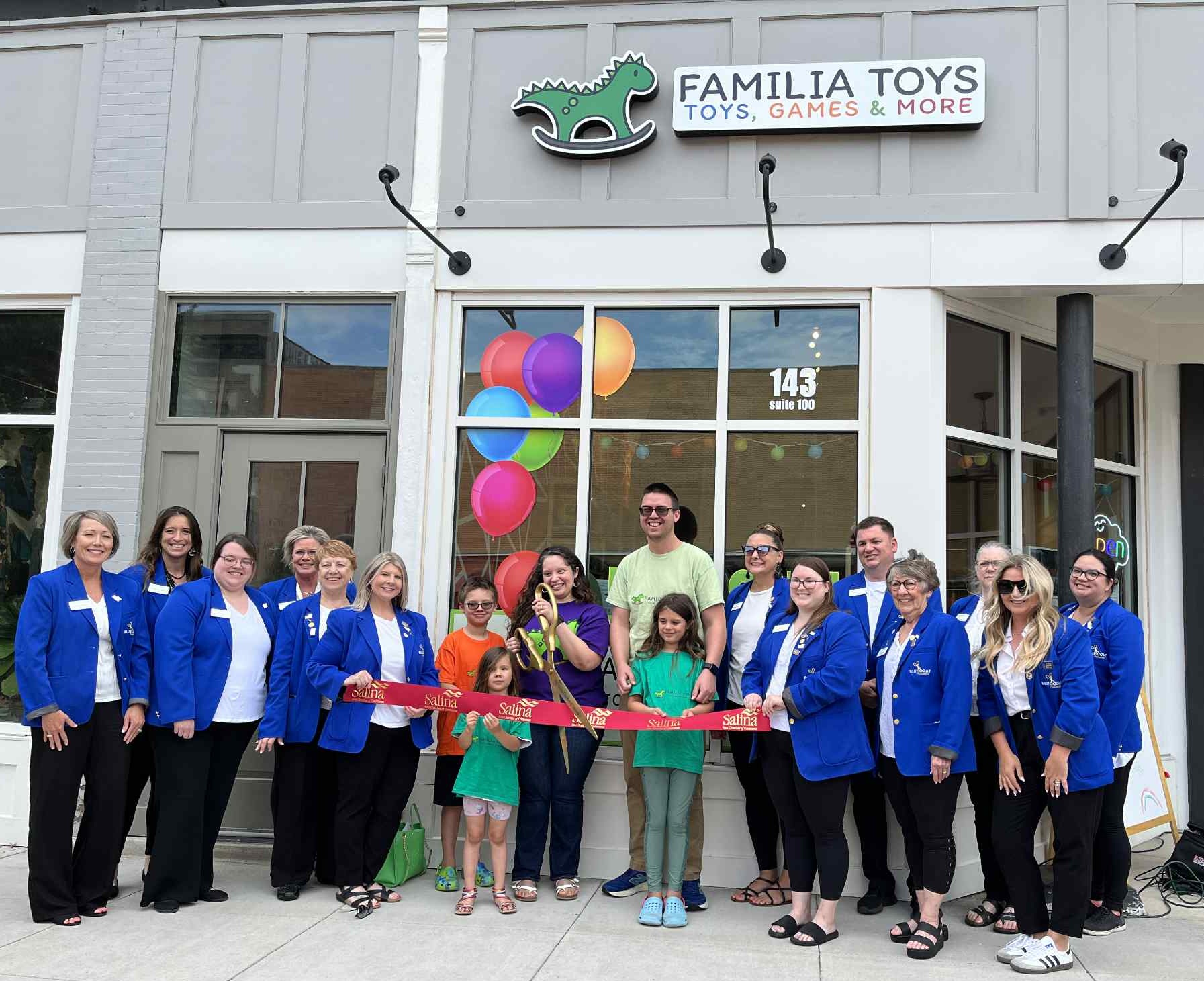 The Swenson family, with help from the Chamber of Commerce Blue Coats, cut the ribbon at Familia Toys.