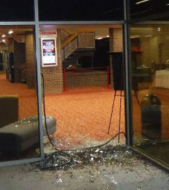 The suspects apparently threw a brick through a southern window of the main lobby to gain access.
