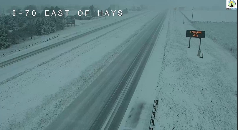Interstate 70 is closed between Salina and the Colorado state line due to winter weather and reduced visibility causing dangerous travel conditions. Many secondary roads also closed in northwest Kansas due to dangerous travel conditions. Travelers are cautioned not to drive around the road closures, barricades, and gates.