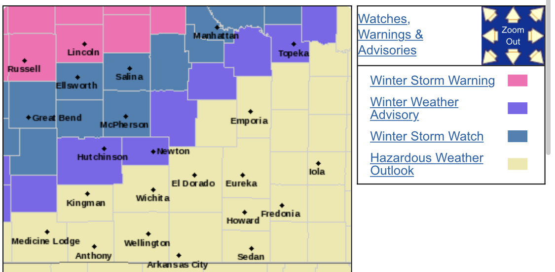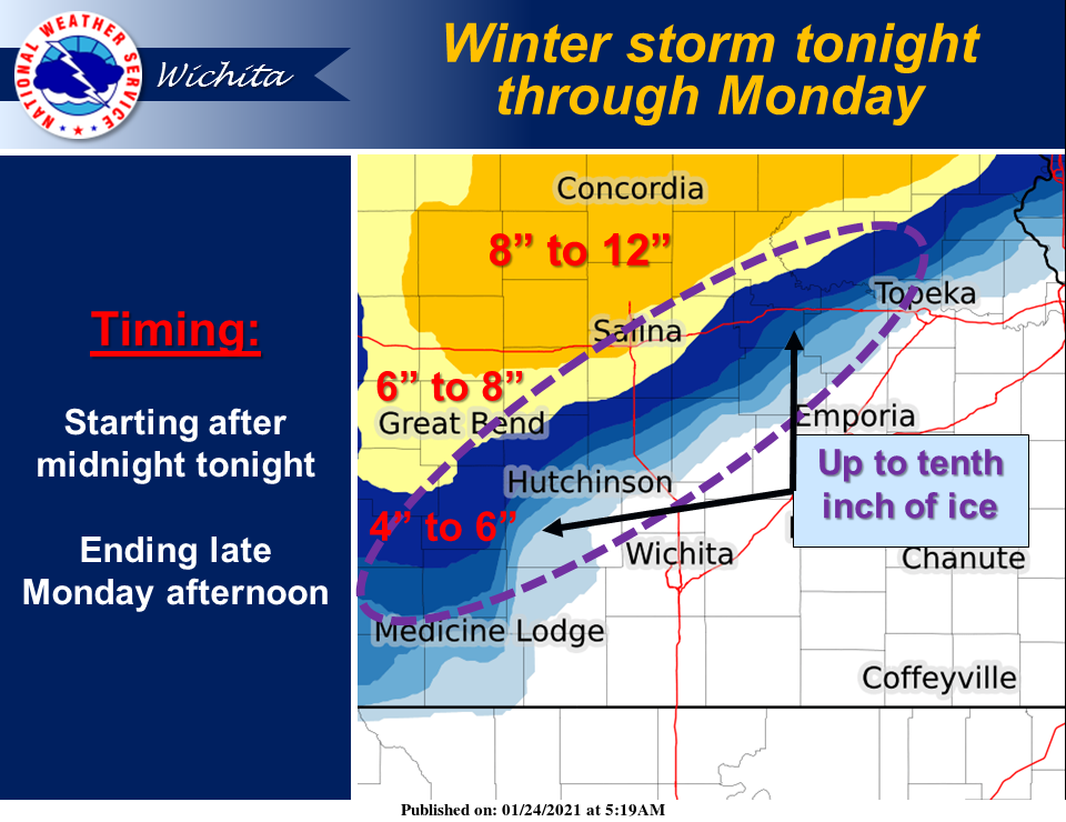 According to the National Weather Service, a mix of ice and snow will begin, probably after midnight. Northern Kansas is under a Winter Storm Warning, Central Kansas a Winter Storm Watch, and Southern Kansas a Winter Weather Advisory from late Sunday night through Monday afternoon.