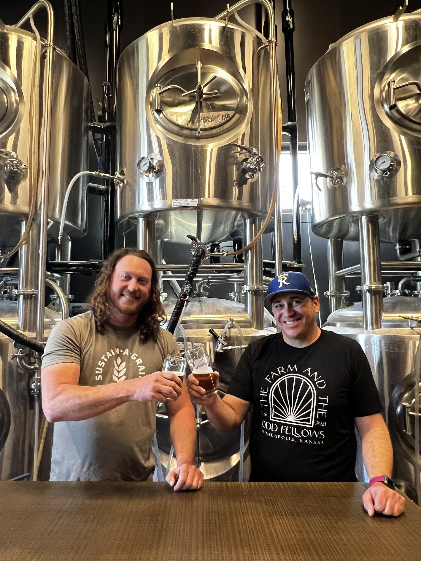 - James Bowden, left, a Saline County farmer-rancher, and Kyle Banman, brewer at The Farm & The Odd Fellows in Minneapolis, Kansas, toast the upcoming Kernza4Kansas event, with glasses of “10 Foot Roots” Kernza® beer. The beverage is exclusive to The Farm & Odd Fellows. Photo by Anna Andersson