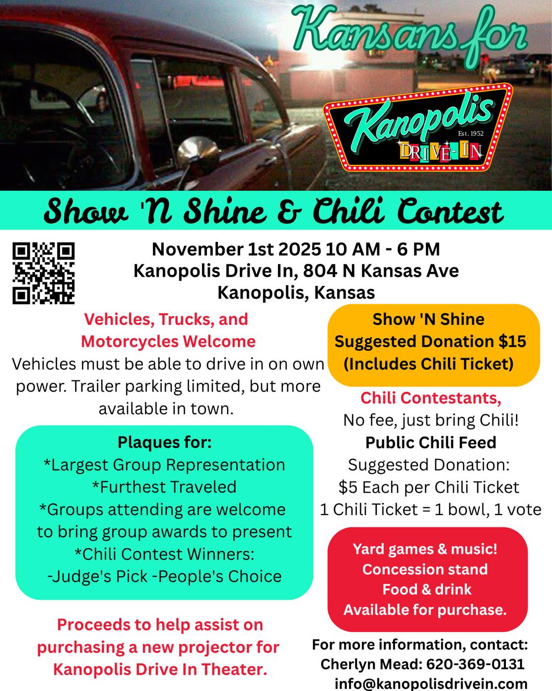 A Show ‘N Shine car show with a Chili Cook-off contest will take place at the Kanopolis Drive-In on Saturday, November 1st to help raise funds as well.