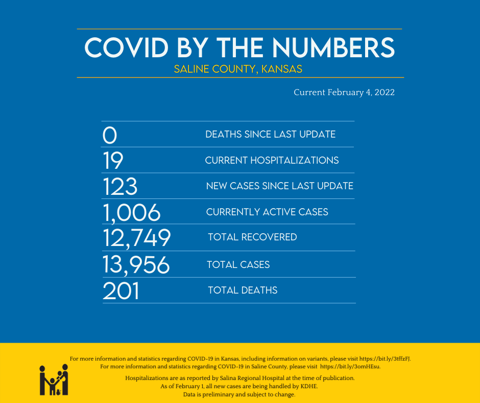 There have been 123 new COVID cases in Saline County since Wednesday and no new deaths.