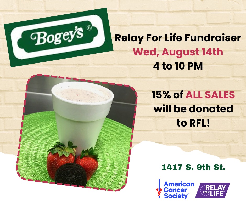 Stop by Bogey’s at 1417 S 9th Street Wednesday, August 14th, between 4:00 PM and 10:00 PM for a great meal, a yummy dessert, or both. Bogey’s will donate 15 percent of all sales during this time frame to the Saline County Relay For Life effort. You can dine in, drive thru, or carry out.
